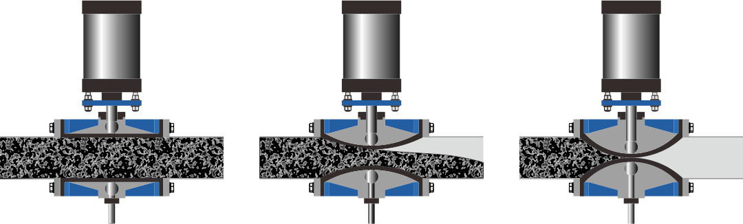 Cerrar: El mecanismo de accionamiento (manual, neumático o eléctrico) empuja dos varillas de sujeción, comprimiendo con precisión el manguito elástico a lo largo de la línea central para lograr un sello elrmético. Incluso cuando hay partículas sólidas en el medio, están firmemente encerradas y bloqueadas.